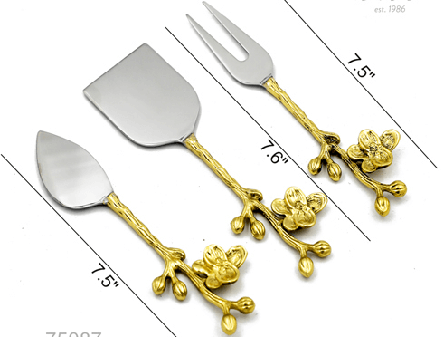 Set de 3 cuchillos para tablas de quesos con detalle de hoja en color dorado.