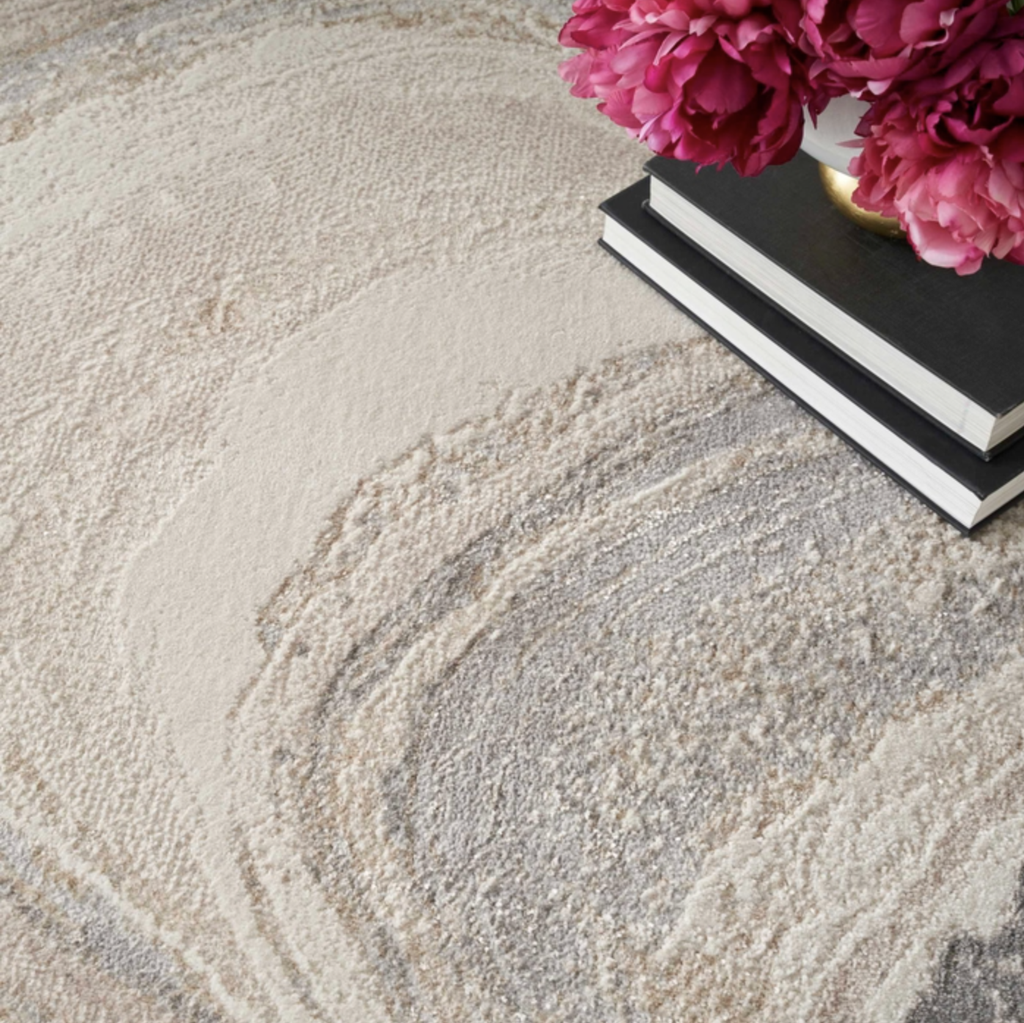 Creada por la diseñadora Farah Merhi una alfombra moderna y abstracta hecha de un material sintético llamado polipropileno, fibra de alto rendimiento, es fácil de mantener y muy duradero. Color llamativo y resistente a la decoloración. Es una combinación de colores gris claro, oscuro, crema y arena. Disponible en dos tamaños.