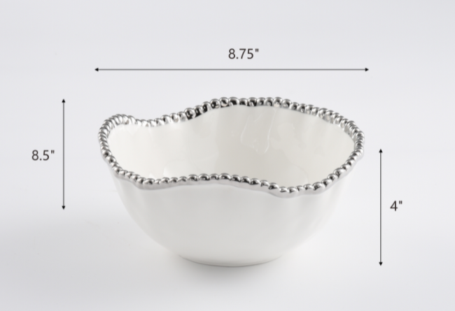Sirva una variedad de comidas calientes o ensaladas con facilidad. Disponible en tres tamaños la mediana mide 10.5 × 10 × 4.5 pulgadas y la pequeña 8.75 × 8.5 × 4", el snack bowl 5 × 5.5 × 2.75. Porcelana fina blanca reluciente con brillantes perlas color titanio. Resistente a rayones, horno (550°), no pierde color, seguro para todo tipo de comidas y lo puedes meter a la lavadora de platos.