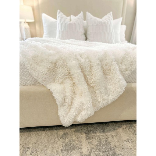 Throw suave tipo fur mide 60x50 pulgadas, su color es un blanco hueso. Lo puede meter a la lavadora.