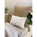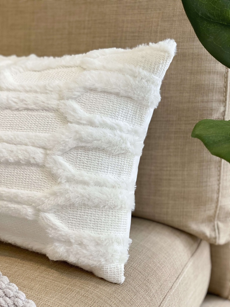 Cojín lumbar blanco con textura en forma de cadena, el relleno es de fibra y el forro se quita para lavar. Mide 12x20 pulgadas.