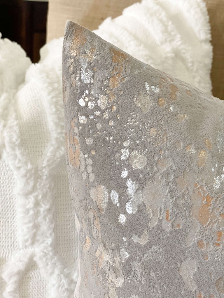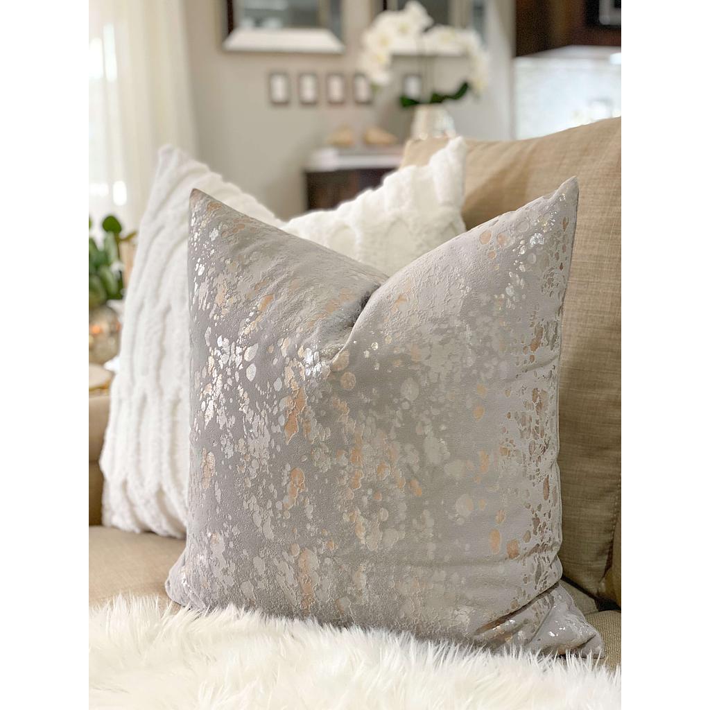 Forro tela tipo velvet color gris con detalles abstractos metálicos disponible en dos tamaños te recomendamos llevarlos al dry clean (Te recomendamos el relleno nube 22x22 pulgadas para el forro 20x20 y el relleno nube 20x20 para el forro 18x18 para crear el efecto de la foto)