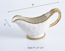 Gravy boat de porcelana mide 9 largo x 5 de alto pulgadas. Porcelana fina blanca reluciente con brillantes perlas color dorado. Resistente a rayones, horno (550°), no pierde color, seguro para todo tipo de comidas y lo puedes meter a la lavadora de platos.