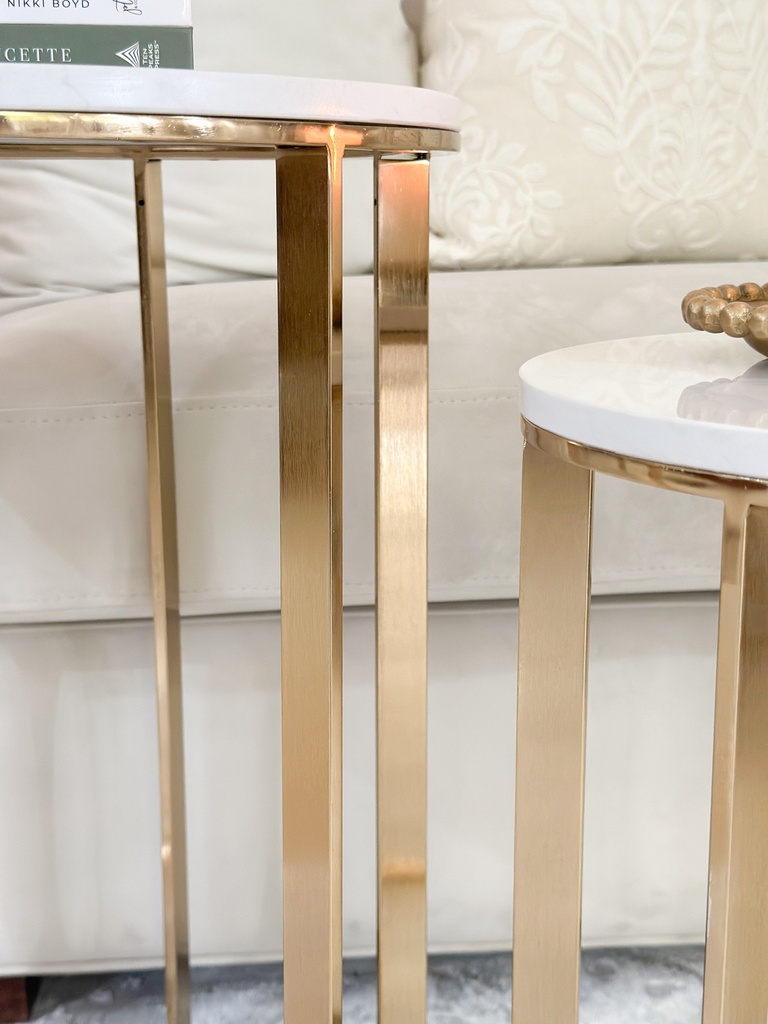 Mesa con top de marmol y base de hierro cepillado dorado la grande mide 24 pulgadas de alto x 16 de diámetro y la pequeña 20x13.